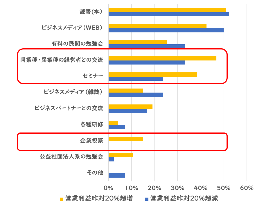 社長onlineが実施した、315名の社長を対象にしたアンケートを分析すると、業績の良い企業の社長の情報収集で目立ったのは「セミナー」「経営者同士の交流」「現場視察」でした。営業利益昨対20%超と昨対20%減の情報収集を比べて差が出たのです。