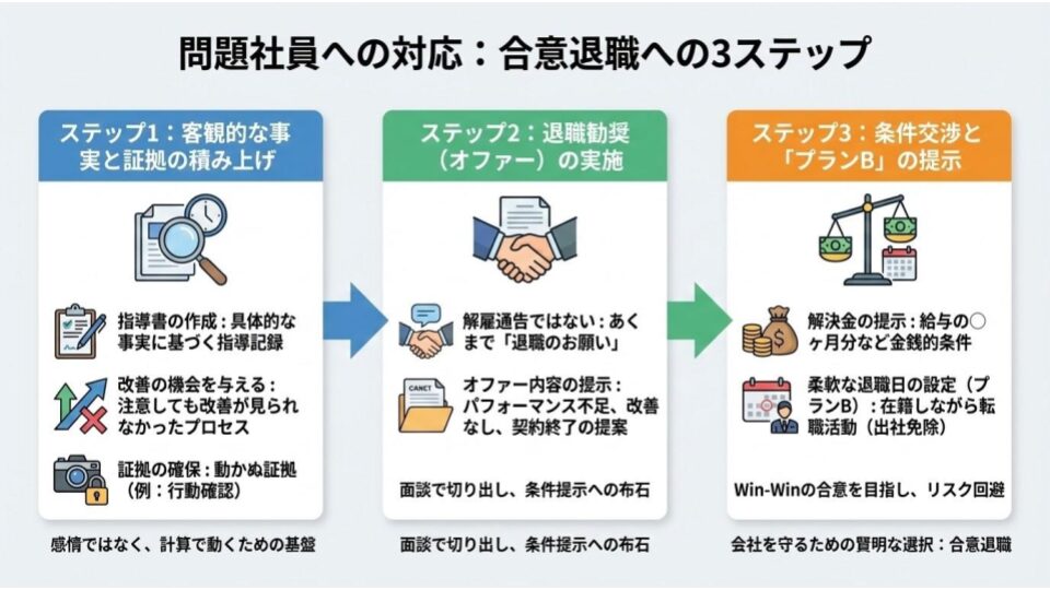 ● 解決金の提示: 「今月末で退職することに合意してくれれば、給与の○ヶ月分を解決金として支払う」といった金銭的な条件