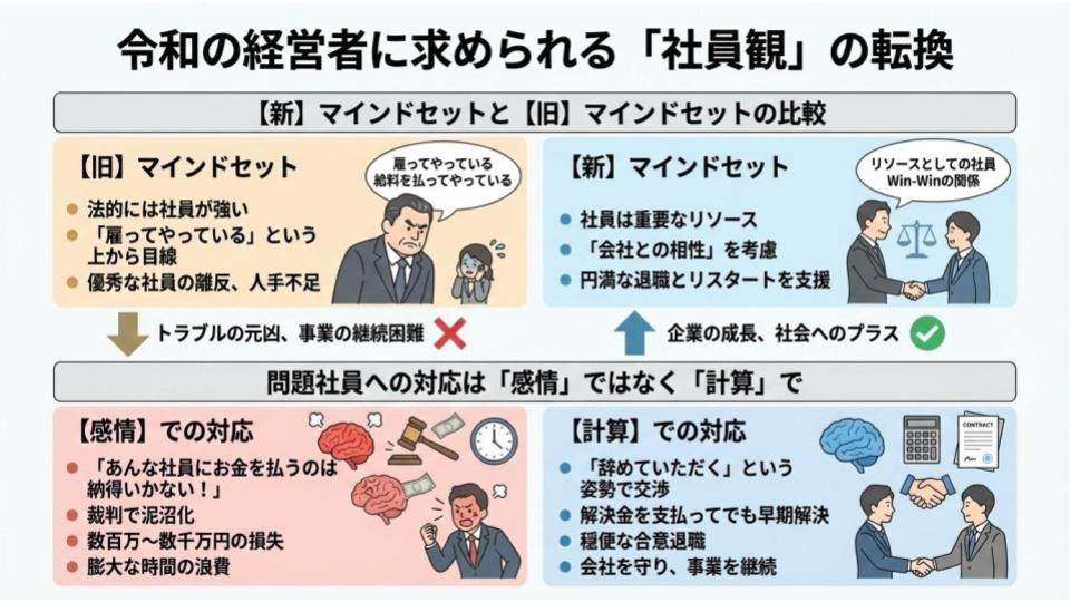 「会社と社員の関係において、法的には社員のほうが圧倒的に強い立場にあります。まずはその現実を受け入れることです。『雇ってやっている』『給料を支払ってやっている』という上から目線の態度は、トラブルの元凶になります」