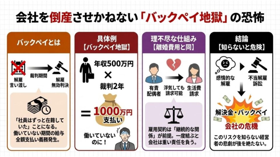 年収500万円の社員であれば、2年で1000万円。会社はまったく仕事をしていない社員に対して、この額を支払うことになります。これを私は『バックペイ地獄』と呼んでいます。